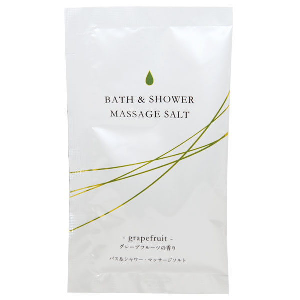 シャワーだけでもOK!直接マッサージできる入浴剤が登場!お肌をなめらかにひきしめる全身美容マッサージソルト(1回分)。 天然海塩とパパイン酵素が古い角質や汚れを落としお肌をひきしめます。 さらに6種類の保湿成分を配合し、しっとりなめらかなお肌へと導きます。 使用方法はお肌を濡らした後、全身にパックし軽くマッサージして十分に洗い流します。 マッサージ後洗い流さずにそのままの入浴も可能!もちろん入浴剤としてもご使用頂けますので、お風呂に浸かりながらの全身マッサージも出来ちゃいます。 爽やかなグレープフルーツの香りに包まれながら、素敵なバスタイムをお楽しみ下さい。