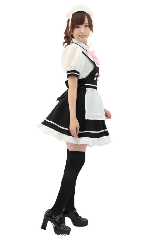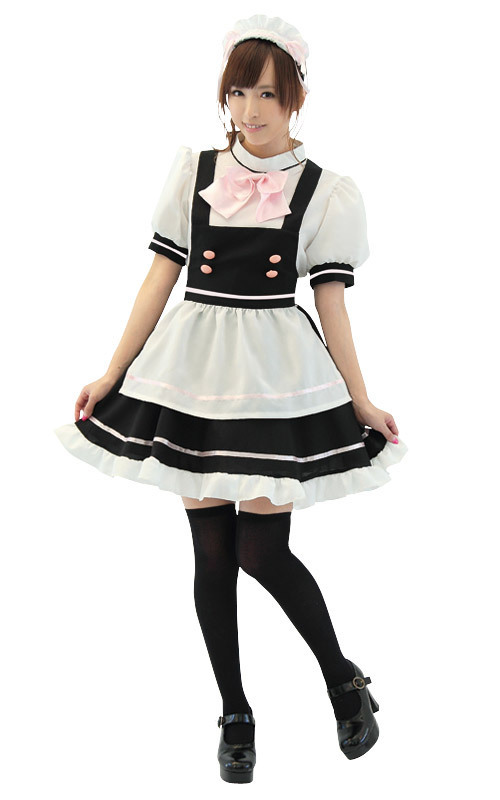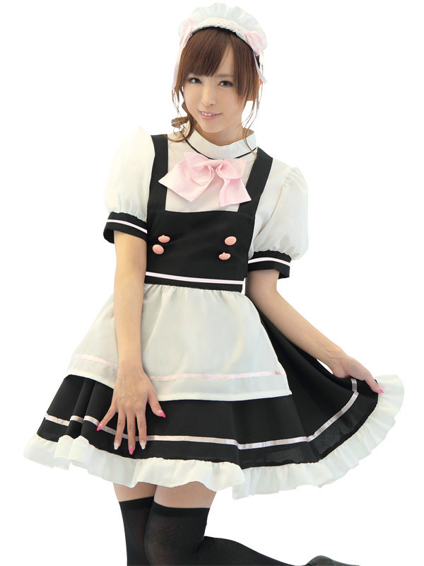 萌え系スタイルに彼も萌え萌えに…!?黒×白のシンプルなメイドワンピースにピンクリボンとピンクボタンを施し、キュートさをプラスした超ラブリーなメイドコスチューム。 ワンピース・エプロン・カチューシャの3点セットでとってもお得なアイテムです。