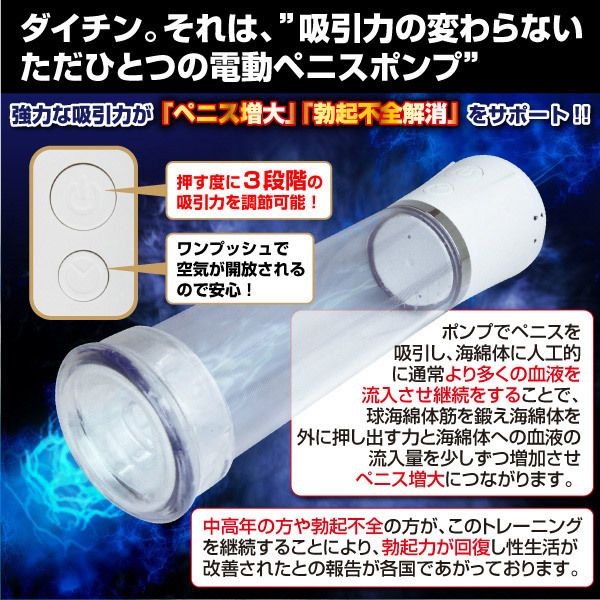 ボタンプッシュで自動的に吸引!球海綿本筋のトレーニング用、電動タイプのペニス増大ポンプ。