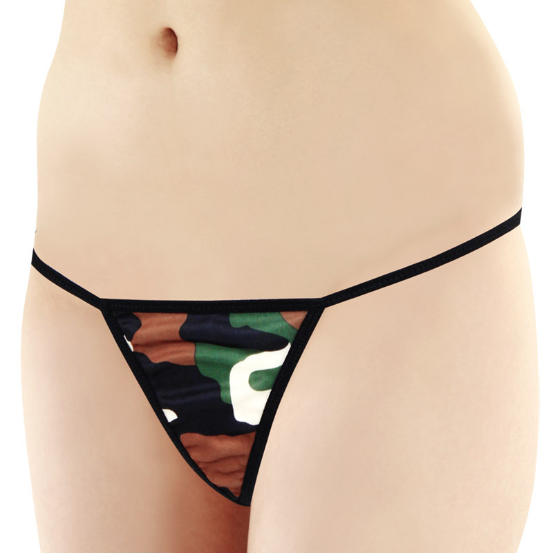<EROX>コスチュームのお供にも♪アウターに響きづらいTバックショーツ。 ●迷彩柄×ブラックのアーミーカラー●ミニマムな三角形フロント●繊細ストリングなサイドデザイン●セクシー度高めな大胆Tバック。 タイトなアウターにも響きづらいので普段使いもバッチリ!ブラック・ブラウン・グリーンと多彩なカラーを使用しているので、あわせるブラジャーも選びやすいのが嬉しいですね。