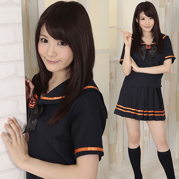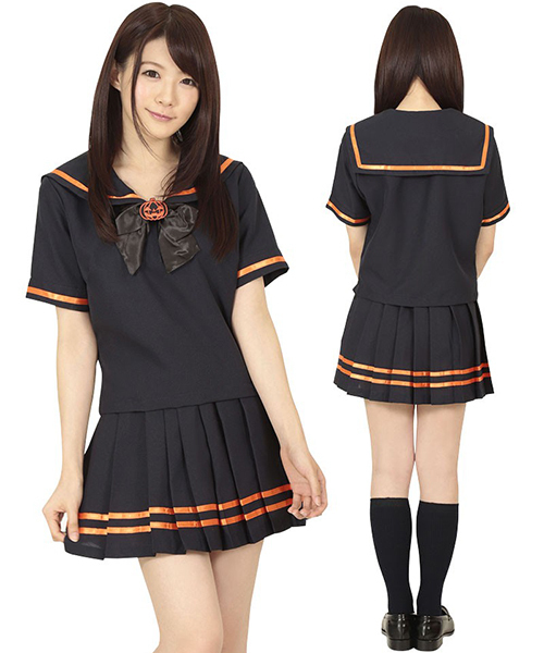 制服コスプレでさりげなくハロウィンモード♪ブラック×パンプキンカラーのセーラー服。 ●黒ベースの半袖セーラー服●オレンジカラーのライン入り●遊び心満載の可愛いワッペン付き。 リボンやセーラー襟にはハロウィンの風物詩「ジャック・オー・ランタン」のワッペンが!ホームパーティーやお店のイベントにもオススメのコスチュームです。