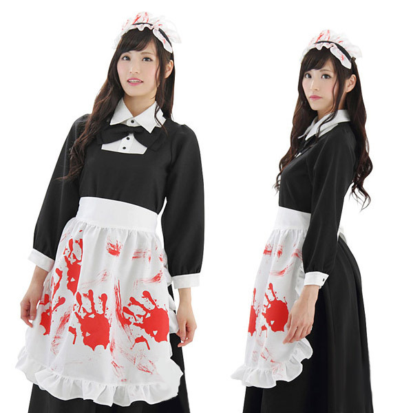 うそっ、血まみれ…?!赤い手形がベッタリついたホラーテイストのメイド服。 ●ハロウィン仮装に便利●定番の白黒メイドを一瞬ぎょっとするほどスプラッターに…●スカート丈が足首まであるクラッシックな長袖ワンピース●後姿はごく普通●手形ペタペタ・フリルエプロン●血が飛沫したブリムカチューシャ。 一体型ワンピースは鮮血加工されていないので、お手持ちのエプロンを着ければ普通にお使いいただけます。