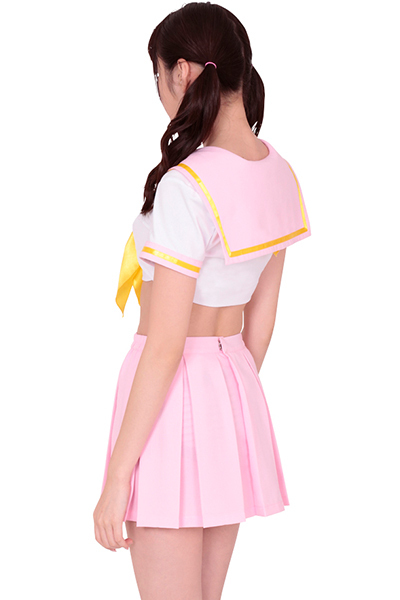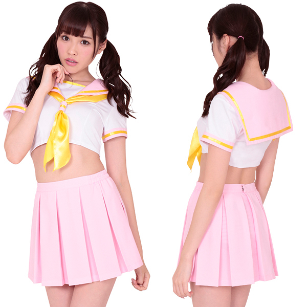 まるでお菓子みたいにキュート♪優しいパステルカラーのセーラー服コスプレ。 ●ピンク・白・黄色のカラフルなセーラートップス●夢見るピンクのプリーツスカート●ファンシーな黄色のスカーフタイ。 ヘソ出しのミニ丈でセクシーさもプラス!女の子らしいパステルカラーの3色をバランス良く取り入れた甘々なメルヘンデザインで、キュートな女子校生になれる制服コスチュームです。