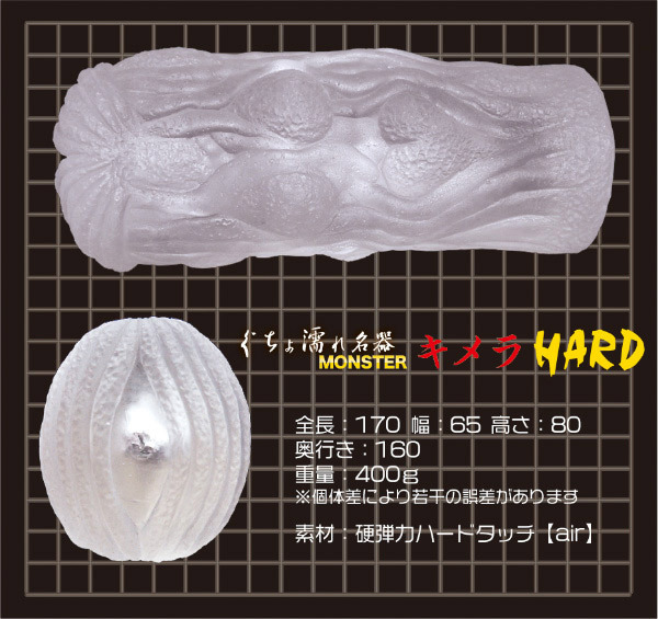 もっとギチギチ!前作よりハードになって登場した硬弾力素材のオナホール。 ●ぐちょ濡れ名器MONSTERキメラのハードタッチairバージョン●イボヒダ満載・ペニスを締めつけながら至高のギミックで責める●膣内の生態を感じる複雑な造形●裏返し簡単・耐久性が高くメンテナンスが楽●本気汁ローション(内容量50ml)つき。 素材が変わるだけでこんなに違うと実感できる高刺激オナホールです。