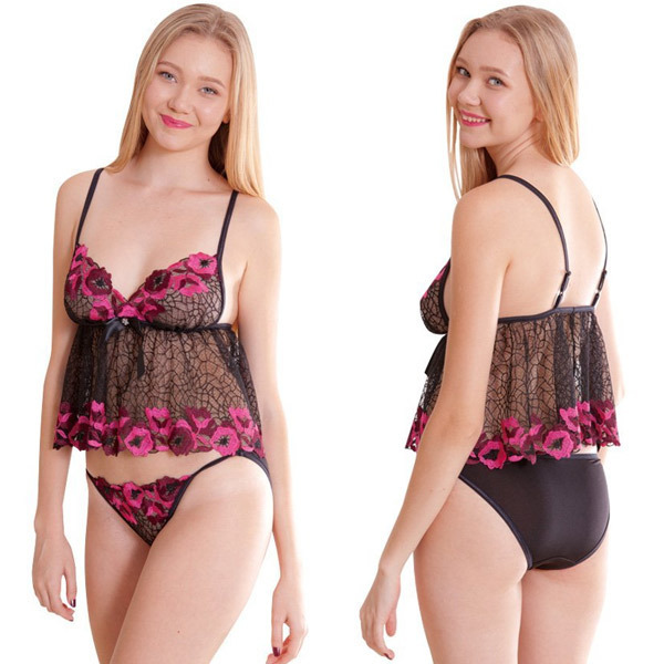 ブラックメッシュにローズカラーの花刺繍!お洒落で大人可愛いミニ丈ベビードール。 ●胸元・裾・ショーツのフロントに大輪の花を連続で刺繍●ふんわりミニ丈・ウエストがチラ見えてセクシー●肩紐調節可能・背面アジャスター付き●ハーフバックショーツで丸みを潰さず美尻を演出。 女性らしい魅力を放つ、ラグジュアリーなランジェリーセットです。