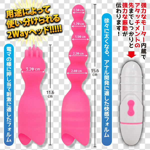 その日の気分によって使い分けできる2種類のアタッチメント付き!女性向けにつくられたピンクのアナルバイブレーター。 ●連なる5つの凸凹ボール×刺激的なブラシ突起●2つのシリコンヘッド(付属)●エイナスヘッドは全長(本体装着時):21.2cm/最大径:2.4cm●ブラシヘッドは全長(本体装着時):17.1cm/最大径:3.2cm●強力モーター内蔵●アタッチメントの先端までしっかり伝わる12種類の振動パターン●振動は弱→強へと変化●生活防水仕様●単四電池×2本使用(底部に電池BOX)。 「押し当て」&「挿入」ダブルの快感を体験できるアナルバイブレーターです。