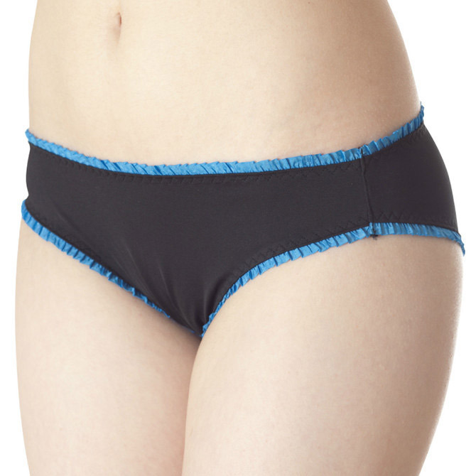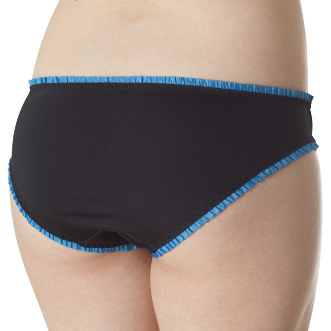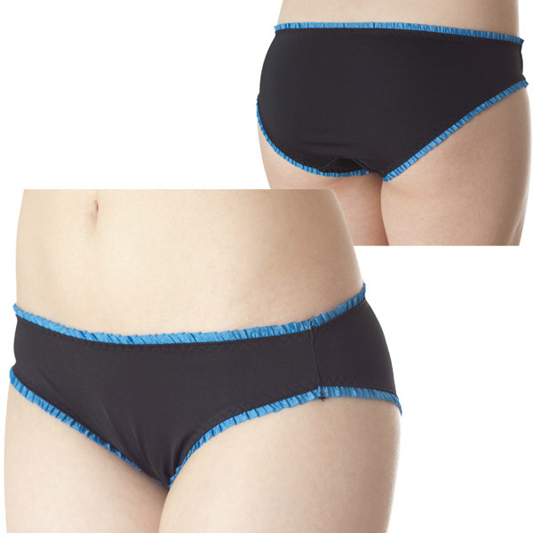 デイリー使いにピッタリ!チラ見えしても可愛いフリルショーツ。 ●ブラック×ブルーの知的カラー●飾りを省いたシンプルデザイン●細かなフリルで上下を縁取り●ナチュラルなフィット感●安心感のある深めの足ぐり。 花びらのような繊細フリルをたっぷりあしらったラブリーさと、すっきり無駄のないシンプルさが魅力的な女性用ランジェリーです。