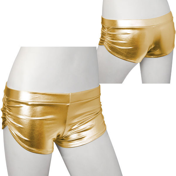 ●金属的な煌めきのゴールドカラー●フィット力抜群な伸縮素材を使用●インナーが見えづらいローライズ●両サイドにギャザー入り。