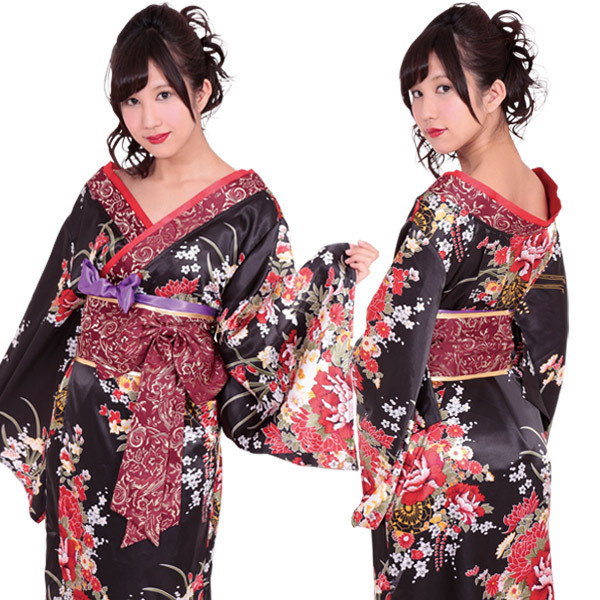色っぽくも凛と着こなす和風スタイル♪豪華絢爛な花魁風のロング着物コスチューム。 ●しっとりとした黒ベースの華やかな和柄●ざっくり背中魅せの花魁風●裾はフィッシュテールデザイン●簡単着付けの作り帯&帯ひも付き。 衣紋(えもん)を大きく抜いたセクシーな背中魅せにドキドキ!花魁着物のように豪華な和柄を取り入れたオトナ系の着物コスチュームです。