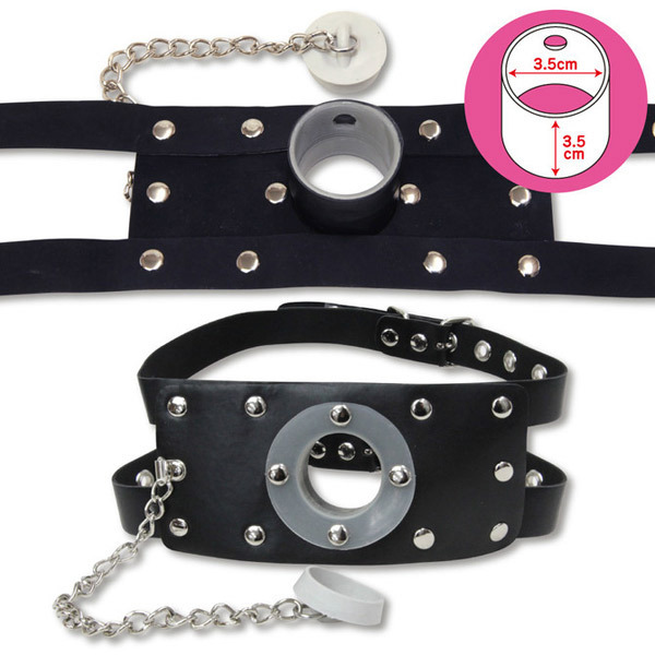 排水栓付きで羞恥心も倍増!拘束プレイ用の開口式マウスギャグ。 ●シックなブラックフェイクレザー●スタッズ使いがハードな本格派●筒型の口枷内径は3.5φcm●チェーン付きの栓で開閉可能●上下2本のベルトで調節&固定可。 筒状のマウスオープナー+栓で口をガッツリ拘束できるプラグ付き口枷。 栓を外せば丸見えの口腔内から涎がダラダラと溢れ出る凌辱仕様のSMグッズ!閉じることの許されない開口式なので強制挿入も可能です。