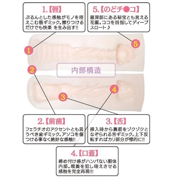 支配感がたまらない!健気にお口でご奉仕してくれるフェラオナホール。 ●外観凹凸ナシのストレートボディ●リアルな女性の唇を模した挿入口●入口から覗く歯が絶妙アクセント●裏筋をニュルッと刺激する舌突起●ゾリゾリなぞる連続刺激の上あご●上下反転でまた違った快感に。 ジュポジュポとディープな挿入感を楽しめるフェラチオプレイを再現!喉奥めがけて突きまくればイラマチオ風なSプレイも可能。 唾液系ローションたっぷりでどうぞ。