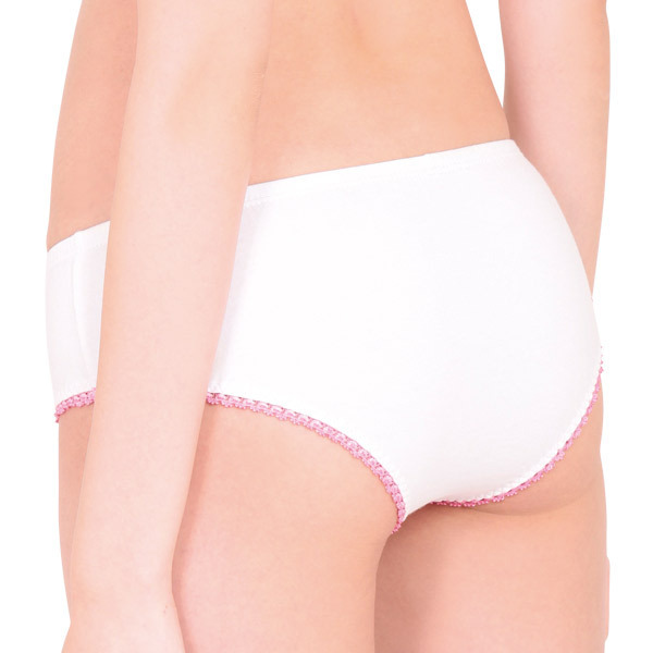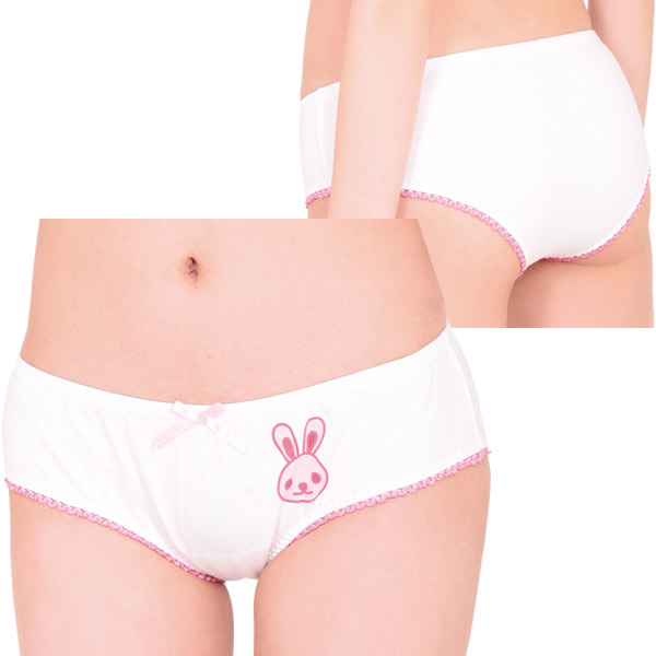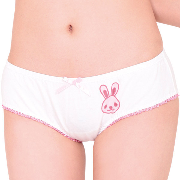 <EROX>ラブリーなうさちゃんプリント付き♪素朴な雰囲気に癒やされるレディースコットンショーツ。 ●やさしい肌触りの綿混素材●フロントにウサギプリント●ちょこんと控えめなピンクリボン●脚ぐりをぐるりとピコットレースで加工●ヒップを優しく包むフルバック。 シンプルだけどインパクトは抜群!深めの履き心地でしっかりフィットしてくれる安心デザインのランジェリーです。