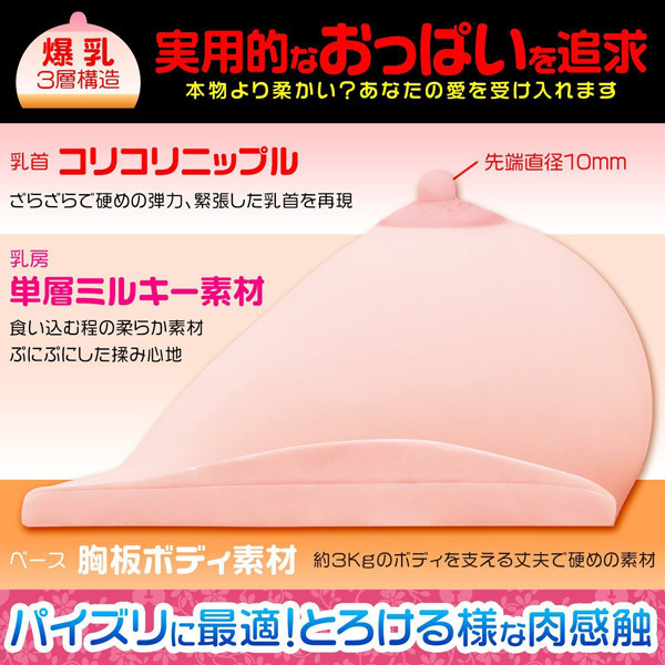 リアルさを追求した夢のようなIカップおっぱい「Iカップパイズリ爆乳」が登場!見た目から触り心地まで魅力溢れる乳房です。 爆乳好き必見の収まりきらないIカップ爆乳は、釣鐘型のフォルムでよりエロさを引き立てています♪乳首もリアルさを追求し、コリコリとした素材で再現!シリコンおっぱいは硬めの胸板素材で支えられ、激しいプレイにも耐えるほか、2700gの超重量級で胸の谷間は深さ9cmとパイズリに最適です!普段ではなかなか出会えないIカップ爆乳を、ぜひお楽しみください♪
