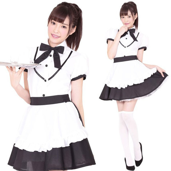 ホワイト×ブラックのカラーのバランスが絶妙!すっきりモノトーンカラーのウェイトレス衣装。 ●可愛らしいパフ袖ブラウス●フリルエプロン付きのミニスカート●デザインを引き締める首元リボン付き。 スタイリッシュな白黒モノトーンコーデを、フレアスカートのふんわりシルエットで大人可愛くまとめたウェイトレスの制服コスプレです。