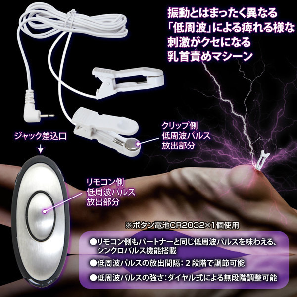 ただの振動では物足りない方へ!クリップ刺激と脈打つパルス刺激でダブル責め出来る乳首ローター。 ●超刺激的な低周波パルスローター●乳首責め用の「サンダーパルス1」●ジャック式ニップルピンチ2個付●ダイヤル式で簡単にコントロール●低周波パルスの強弱は無段階調整●放出速度間隔は2段階の切り替え可●リモコン側にもパルス機能を搭載。 オナニーやSMプレイにも最適♪ビクンビクンと脈打つ低周波パルスの強烈刺激を味わえるエレクトログッズ「サンダーパルス1・ニップルピンチ」。 リモコン側にもパルスが発生するシンクロパルス機能を搭載し、パートナーと快感を共有することも可能!乳首をいじめ抜く癖になるような強い快感刺激は、チクニー上級者の方にもお勧めです。