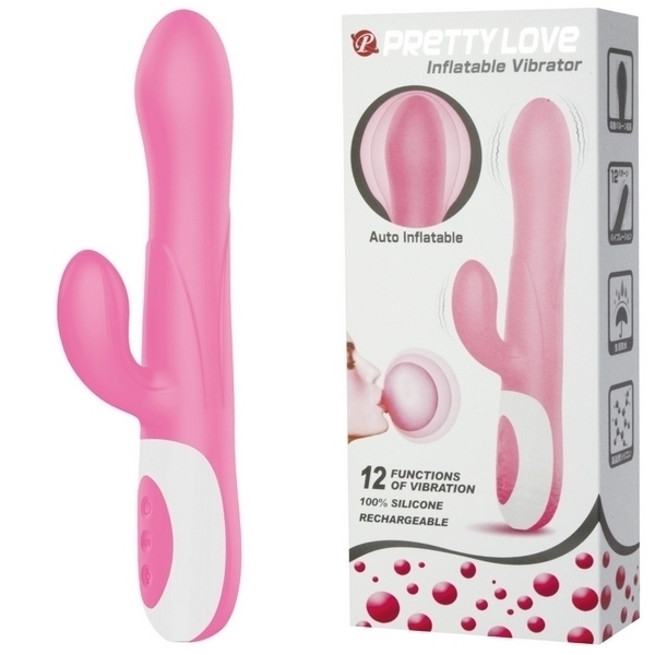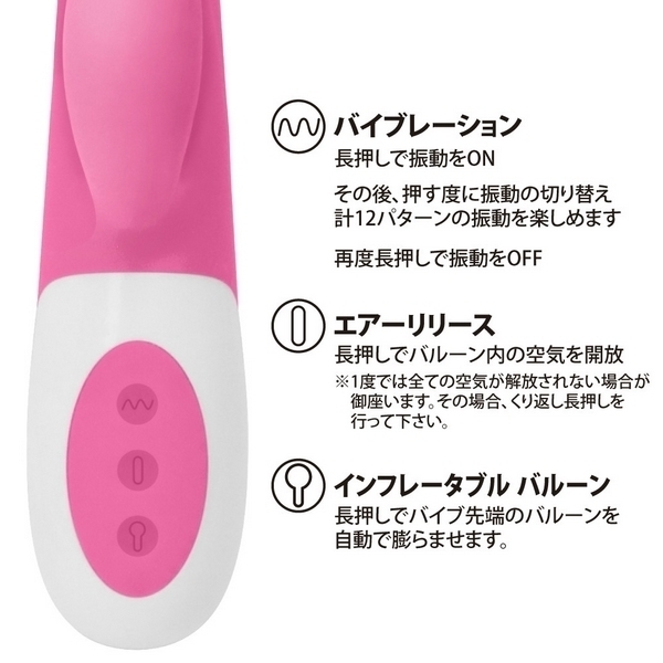 ワンタッチでグングン膨らむエアーバルーン仕様♪拡張にも適した「プリティラブ インフレータブルバイブレーター」。 ●自動で膨らむ先端バルーンモデル●全長24.5cm、通常時の最大径3.6cm●バルーン機能使用時の最大径5.3cm●エアリリース機能で内部空気を解放●ヘッド&クリバイブに12種振動搭載●手触りの良い高品質シリコンボディ●丸洗い可能な生活防水仕様で衛生的●タフなUSB充電式(専用コード付属)。 拡張で感じる新たな快感♪バイブには珍しい電動バルーン機能を搭載した「プリティラブ」シリーズのインフレータブル式バイブレーター。 ボタンひとつで先端が風船のようにプクーッと最大5.3cmまで膨張!さらに、12パターンのバイブレーション機能で多彩な振動刺激も楽しめます。 ヴァギナだけでなくアナル拡張にも最適!空気を解放できるエアリリース機能も搭載されているので安心です。