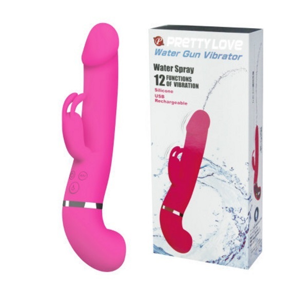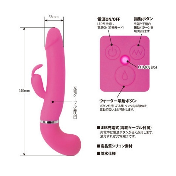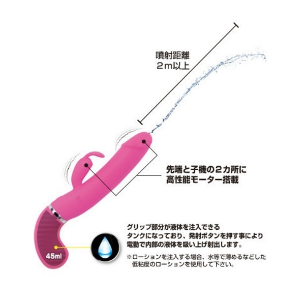 遂に登場!中出し体験ができる疑似射精機能を搭載した高性能バイブ「ウォーターガンバイブレーター」。 ●ピストルのようなシルエット●高品質なシリコン素材を採用●滑らかボディで挿入感も抜群●先端&子機に高性能モーター●12種類の多彩な振動パターン●ウォータースプレー機能搭載●液体45mlをタンクに注入可能●ボタンを押すと先端から噴射●液体の噴射距離は約2m以上●生活防水仕様で丸洗い可能●電源はUSB充電式。 先端からお好みの液体をドピュッと発射!中出し体験が出来るウォータースプレー機能を搭載した「プリティラブ」シリーズのバイブレーター。 雫マークの噴射ボタン押下中は、タンク内(グリップ部)にある液体を自動で吸い上げて噴射し続けます。