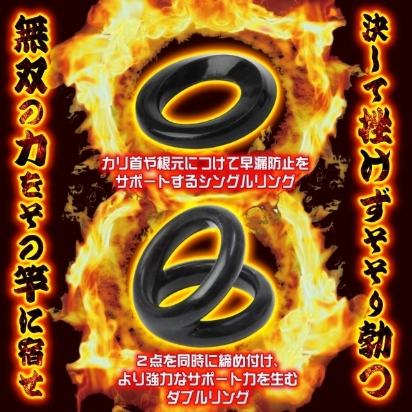 竿に宿る無双の力!シングルとダブルの2タイプがセットになったシリコン製コックリング。 ●100%シリコン製の柔軟リング●カリ首や根元に最適なシングル●シングルリング内径:2.3φcm●二点を同時に締め付けるダブル●ダブルリング内径:2.6φcm●締め付けで早漏防止をサポート。 決して挫けずそそり勃つ不撓不屈のムスコに変身!着け方をアレンジ出来るコックリング2種セット。 2種のリングを同時に装着すれば、まさに一騎当千の戦闘力で無双!早漏防止や勃起力UPをサポートする男性用補助グッズです。