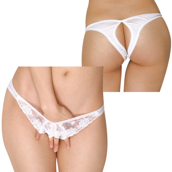 ●ハーフバックデザインショーツ●ホワイトレース×光沢フェリカ地●前から後ろまでオープンカット。