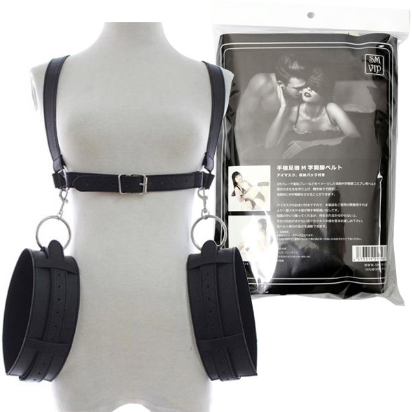 強制的に卑猥な体勢へ拘束!両腕固定+M字開脚ポーズが簡単に出来るSM拘束ベルト&アイマスクのセット。 ●ハードな黒のフェイクレザー●合皮、柔らかなウレタン素材●フリーサイズ(太腿39〜69cm)●各ベルトはサイズ調節が可能●目隠し用のアイマスクもセット。 まんぐり返しやM字開脚も思うがまま!腕を拘束+足を開いた卑猥なポーズへと簡単に固定出来る手枷&足枷ベルト。 ベルト式なのでSMビギナーさんでも簡単に拘束可能!アイマスクで視界を奪われ、手足の自由がきかない状況でのドキドキ感を存分に味わえるSMグッズです。