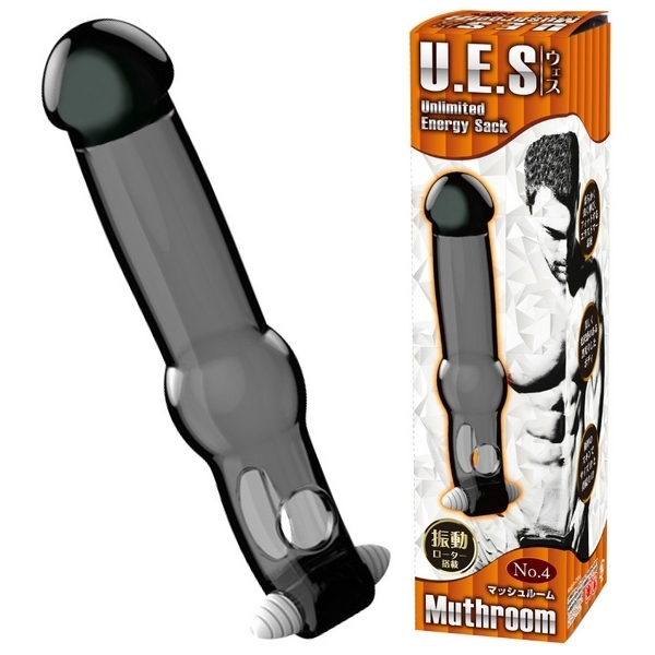 Wホールドでサイズアップ&ロングプレイ!ユニークフォルムの極厚ペニスサック「UES(ウエス)4 マッシュルーム」。 ●オールカバーの電動サック●先端&中間が膨らんだ「No.4」●全長19.3cm、亀頭部4.0φcm●キノコ形状の黒光りボディ●自身のサイズを約3cm延長可●極厚仕様のエラストマー素材●伸縮素材でしっかりフィット●根元を締め付ける玉袋用の穴●玉袋裏側にミニローター付属。 大きく膨らんだキノコ型ヘッドでロングに変身!極厚スキンで竿全体+玉袋をガッツリ締め付けて持久力を高めながら、振動快感も得られる男性補助グッズ。 付属のローターは取り外し可能ですが、電池交換不可の使い切りタイプです。