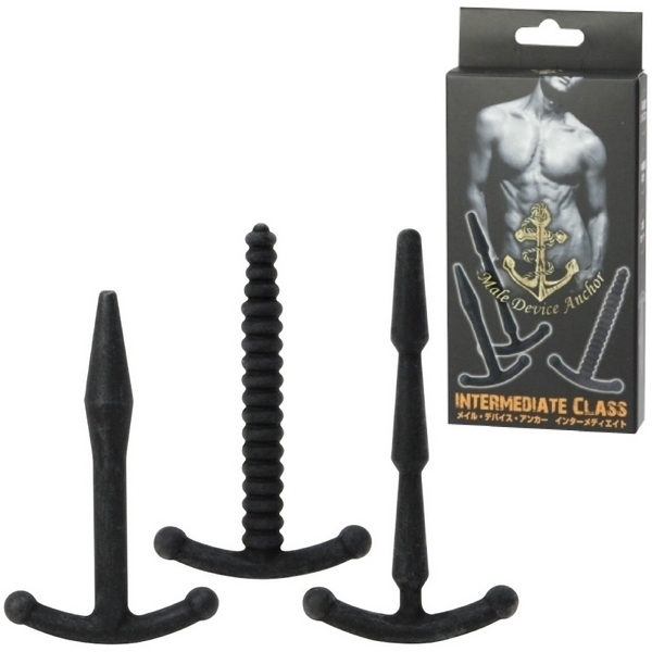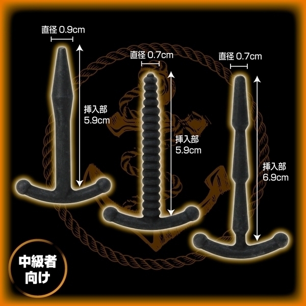 CBT中級者さんの尿道責めプレイに♪錨デザインの尿道プラグ3個セット「メイルデバイスアンカー インターメディエイト」。 ●マニア向けの尿道プラグ×3個セット●柔軟性のある高品質シリコンを採用●長さのある中級者向けのミドルサイズ●タイプ1:挿入部長5.9cm×直径0.9cm●挿入しやすい矢尻型のヘッド形状●タイプ2:挿入部長5.9cm×直径0.7cm●最初から最後まで続く凸凹リブ形状●タイプ3:挿入部長6.9cm×直径0.7cm●引き抜き時が刺激的な3連の円錐形状。 究極の快感テクニック、尿道責めで新たな快楽を!フェティッシュなCBTプレイ用のSMグッズ。 刺激の高さと負担の少なさを両立させた程良い長さの「インターメディエイト」タイプは、尿道責めプレイ中級者さんの拡張用にも最適です。