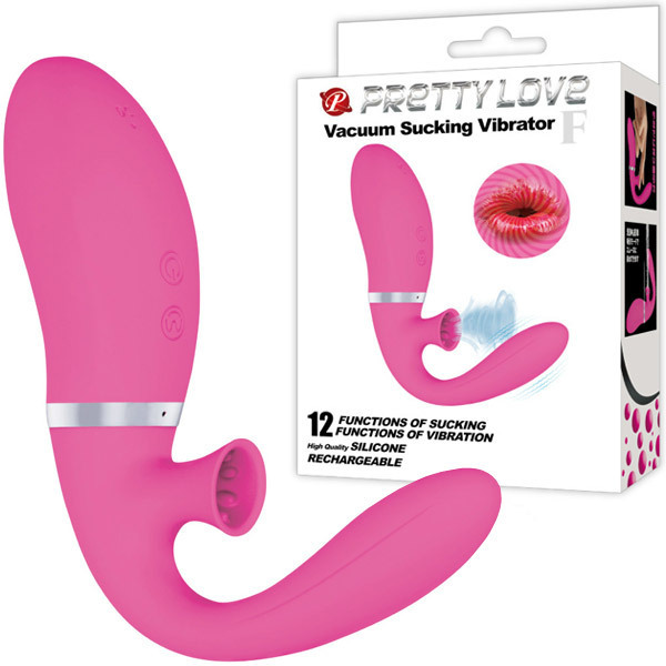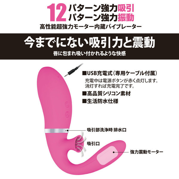 挿入しながら強力バキューム♪クリバイブに吸引機能を搭載した新感覚のバキュームバイブレーター「プリティラブ バキュームサッキングバイブレーターF」。 クリ吸引グッズとGスポットバイブが合体!ありそうでなかったF字型バイブレーター。 セルフプレイに最適なF型フォルムで驚きのフィット感を体感!肌触り抜群の高品質シリコンボディは全長10cm、最大径は3cm。 挿入部ヘッドに内蔵された高性能モーターがGスポットを刺激。 さらに、唇に吸い付かれるような刺激を生み出す吸引機能を搭載!強力な12パターンの吸引&振動を味わえます。 フル充電約90分で連続稼働約50分のUSB充電式(専用ケーブル付属)。 クリ吸引部洗浄用の排水口が配置された生活防水仕様!内部までしっかり洗えるので衛生的です。