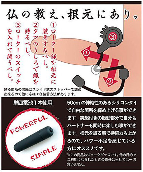 男の快感を助太刀!ロングなループタイデザインの電動ペニスリング「SUKEDACHINAWA(スケダチナワ)法」。 ●伸縮性のあるシリコンタイ●長さ約50cmのロングタイプ●スライド式で簡単に調整可●クリ用突起付きのローター●簡単操作のワンタッチ電源●ローターは着脱可能。 仏の教え、根元にあり!ロングなシリコンタイでお好きな箇所を自在に締め上げる男性用補助グッズ。 ローター部を根元に装着し、玉袋の後ろで縄を縛ってローターのスイッチをON!締め付けによる持久力UPだけでなく、クリトリスに刺激を与えるローター搭載でパートナーと快感を共有可能!快感もパワー不足もアシストしてくれるマルチなアイテムです。