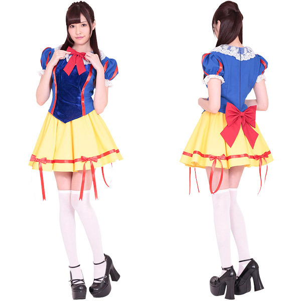 可愛すぎるスノープリンセスに変身♪クラシックなデザインのお姫様コスチューム。 青、赤、黄色の定番カラーで仕上げたおとぎの国のヒロイン衣装♪トップスの襟に幅広レース&赤リボン、プリーツスカートには裾リボン、さらに大きめのバックリボンなど可愛いを凝縮!全てがラブリーな愛されプリンセスコスチュームです。