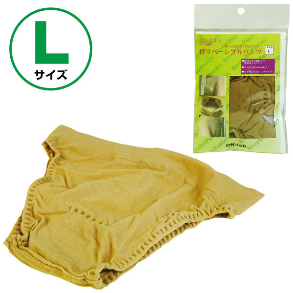 その日の気分で変身♪男女どちらも楽しめるハイブリッドな女装用パンティ「性リバーシブルパンツ(L)」。 ●肌触りの良いベージュ色のブリーフ●伸縮性抜群のストッキング生地を使用●パンティの前後に筒状のペニス収納袋●下向き装着:女性感覚ですっきりと収納●上向き装着:ペニスを擬似勃起状態で維持●フリーサイズ(最大ウエスト約85cm)●ペニスト筒サイズ(L):9.0×2.5cm。 あなたの願望叶えます♪男女どちらにも固定可能な筒を内蔵!股間処理が簡単に出来るショーツ型のペニストッキング。 下向き固定の場合はクロッチをずらせばそのまま排尿も可能!ピタっと密着するので包皮を剥いたまま固定すれば、包茎矯正用としても効果を発揮します。