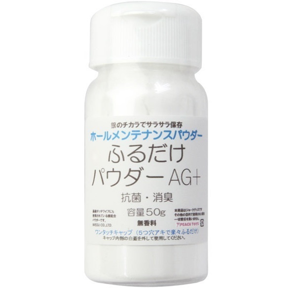 銀のチカラでサラサラ保存♪無香料のオナホール専用メンテナンスパウダー「ふるだけパウダーAG+ 50g」。 ●5つ穴開きのワンタッチキャップ●抗菌・消臭に優れた銀イオン配合。 お気に入りを長く愛用♪オナホのメンテンスに必須の専用パウダー。 洗浄後の乾燥させたホールにパウダーをまぶし擦り込むだけ!コーティングしてから保管することで劣化を抑制、さらにAG配合で抗菌効果も期待できます。 指で直接馴染ませても問題ありません。