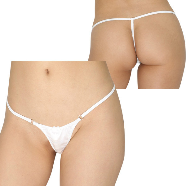 内側に秘密の6連ビーズ付き♪ミニマムな極小フロントがセクシーなホワイトカラーのTバックショーツ。 光沢フェリカ生地のフロントはギリギリまで攻めたミニマムサイズ!両サイドとバックは華奢なストリング仕上げ。 さらに、内側のセンター部分にキラキラゴールドの大玉ビーズを6個並べた大人のランジェリー!一般的なパールショーツに付いているような丸ビーズではなく、凸凹フォルムの多面体なのでより刺激的に楽しめます。