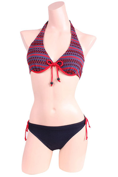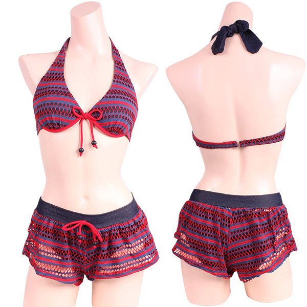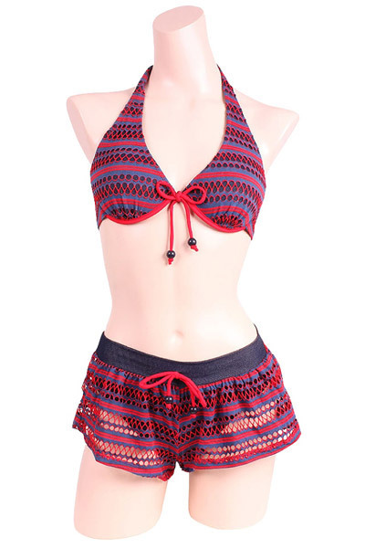 ビーチで周りと差をつける、赤とネイビー本格スイムウェアシリーズ♪ショートパンツありなしで2テイスト楽しめる3点セット。 気分でフレキシブルに着替える事が出来る優れもの。 デニム風合いのストレッチ生地と2色使いのネットボーダー生地を重ねてレディだけどカジュアルなバランスが素敵。 パイピングとチャームのアクセントも絶妙です。