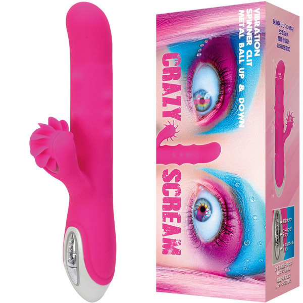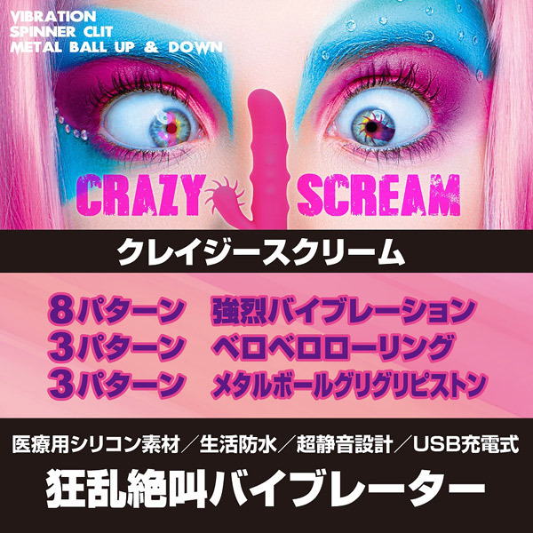 クリをペロペロ&Gをグリグリ!狂乱絶叫のハイスペックバイブレーター「CRAZY SCREAM」。 クリトリスを上下からペロペロ愛撫するローリングブラシを搭載!さらに、内蔵されたムービングメタルボールが上下左右に激しく動き回りながら掻き乱し、快感ポイントを逃さず刺激します。 強烈ヘッド振動は8パターン、子機ローリングは3パターン、メタルボールアクションは3パターンと、バラエティ豊かな刺激を備えたバイブレーター。 医療グレードシリコン製、生活防水&超静音設計のUSB充電式(コード付属)。