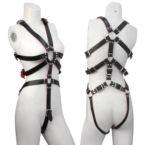 SMプレイの深淵へと導く!赤と黒のフェイクレザーが妖艶な『ABYSS』シリーズのSMグッズ「Abyss(アビス) 亀甲プレイスーツ」。 亀甲縛りのようなデザインで緊縛感も味わえるSMプレイスーツ!各ベルトでサイズ調整可能、材質はフェイクレザー・鉄。