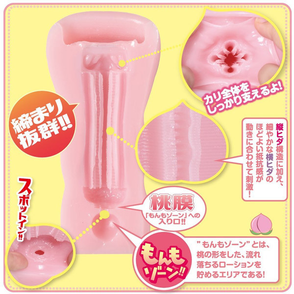 締まり抜群の「桃ずきんちゃんdeもんもん」オナホール!全体を覆う快感縦ヒダ構造は、おなぺっと素材を最大限に体感できる構造の非貫通タイプです。 ゾリゾリッとカリ・ウラスジをしっかりと刺激する8本のロング縦ヒダはまさに新境地そのもの!ほどよい抵抗感が動きに合わせて刺激してくれるので挿入時のアクセントになり、最奥のもんもんゾーンでは、桃の形をした桃膜が流れ落ちるローションをしっかりと受け止めながら、ちゅぱちゅぱと亀頭に吸い付き貴男を快感の渦へと導いてくれます。