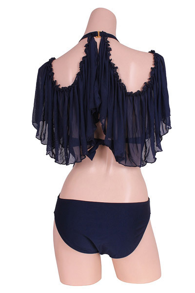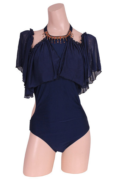 ネイビーをセクシーにさせた!洗練美を加速するメッシュ素材のオフショルダーのワンピーススイムウエアー。 デコルテのジャガード織テープと同色のビーズがラグジュアリー感をひと目で印象つけ、体型カバーもしていただけるデザインです。