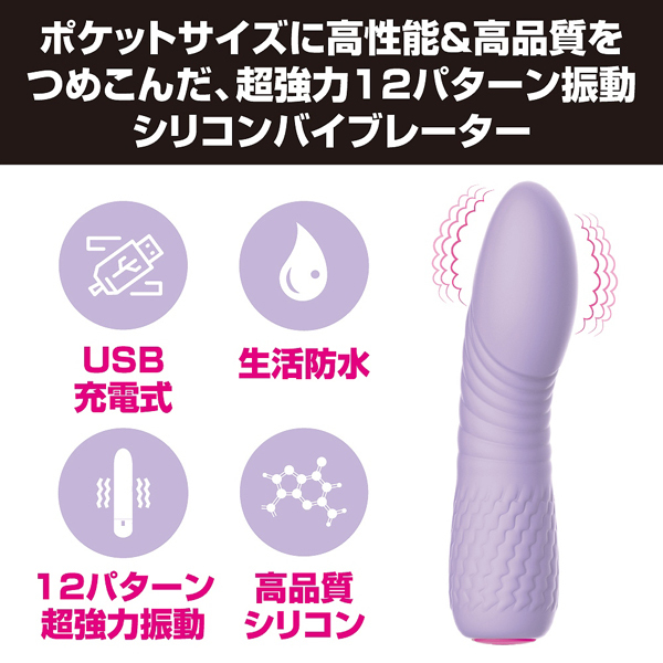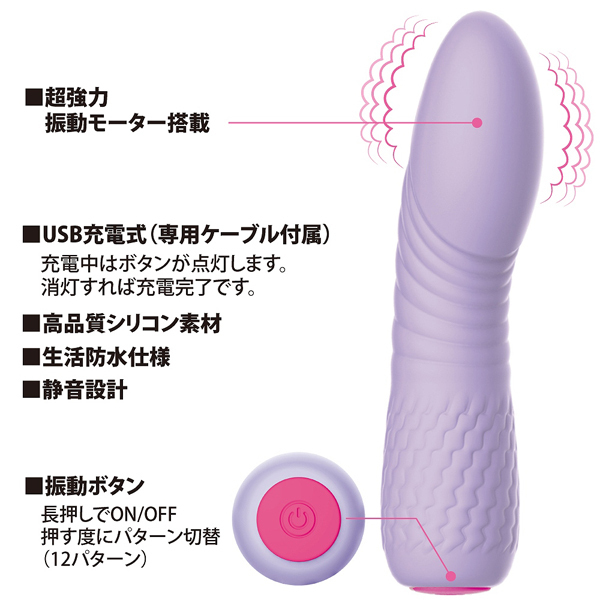 全長11.8cmのコンパクトなボディに高性能と高品質を詰め込みました♪12種の強力振動でピンポイント刺激が楽しめる淡いパープルカラーの一本式シリコンバイブレーター。 触り心地の良いマットな質感の高品質シリコンを使用!乳首やクリに押し当てたり、挿入してGスポを刺激したりなど、どちらの責めにも適したボディなのでお好みの責め方でお使いいただけます。 ご自宅で楽しむのはもちろん、バッグや車内に忍ばせコッソリ楽しむのもアリですよ♪USB充電式(専用コード付)、生活防水仕様となっております。