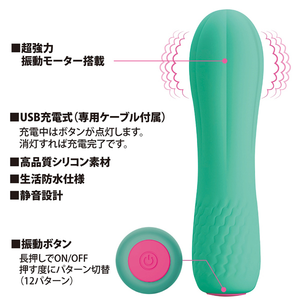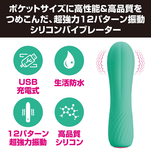 マットな質感の高品質シリコン素材を採用した、携帯サイズのUSB充電式シリコンバイブレーター。 サボテンのような見た目が特徴的なコチラは全長11.6cm、太さ3.1cmの小型タイプながら、なんと12種もの振動パターンと一気に絶頂へと導く強力振動を搭載!出先でも気持ち良くなりたいなんて時には、鞄や車からサッと取り出して楽しめるのもこのコンパクトなシリコンバイブレーターの持ち味。 クリや乳首への押し当て刺激や、挿入してのGスポット責めなどにも最適ですよ♪生活防水搭載、専用コードが付属しています。