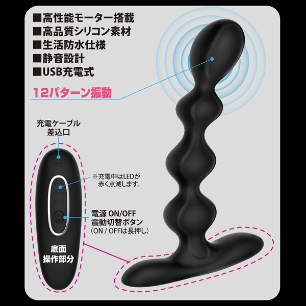 「スティックバキューマー2」等の吸引グッズでお馴染みのプリティラブから新商品が登場!身体の芯に響くような刺激が堪能できる全長17.5cmのロングボディのシリコン製アナルバイブレーター(USB充電式)。 先端に内蔵された高性能モーターが、お尻の中で12種類のハイパワー振動!最大内径27mmのビーズでポコポコと刺激しながら根元まで入れれば底面が会陰を刺激、前立腺を貫く刺激と相まった強い快感に息も絶えだえに♪この強烈な振動は貴方の想像を絶する!!充電コード付属