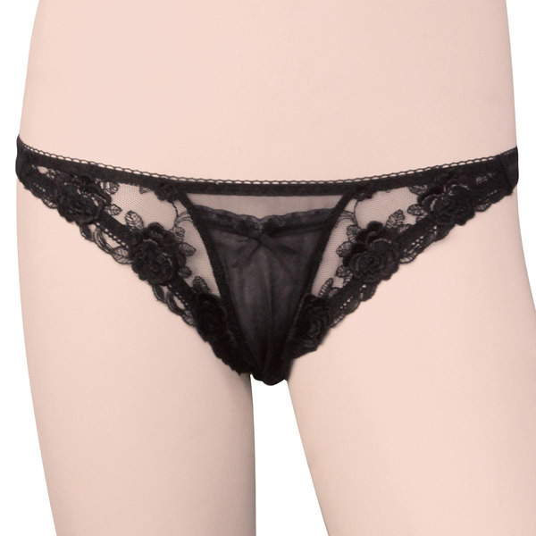大人のオンナを一層引き立てる黒と魅惑のシースルー生地で男を虜に♪リボンとフラワーレース刺繍を施した日本製フルバックショーツ。