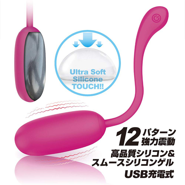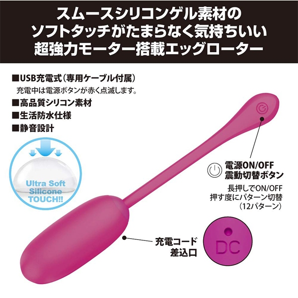 側はサラッとしたシリコン、内側は柔らかなスムースシリコンゲル素材を使用した、ソフトタッチがたまらなく気持ちいい超強力モーター搭載エッグローター!柔らかな優しい挿入感、しかし震動は超強力でGスポットへと快感が響き渡ります。 挿入したままテールの先端にあるボタンで操作が可能。 ●高品質シリコン+スムースシリコンゲル素材●12パターン強力震動●静音設計●生活防水●専用USB充電コード付属