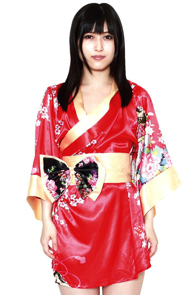 官能的な赤いミニ丈着物に金×黒の帯が映える美しい花魁風の着物コスプレ♪主張しすぎない程度にちりばめられた花模様が大人の色気の中に可憐さをプラスしています。