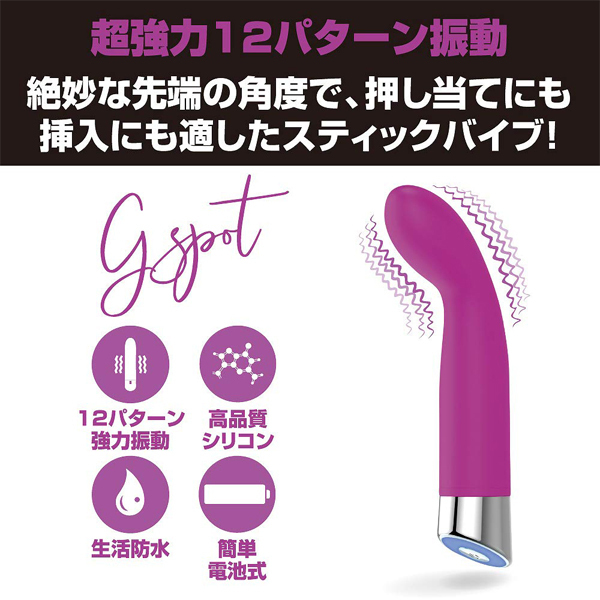 絶妙な先端の角度でGスポットを押し上げ、快感震動が直撃!滑らかで優しい質感のシリコンボディは押し当てにも適してます♪●12パターン強力震動●高品質シリコン●生活防水●電池別売