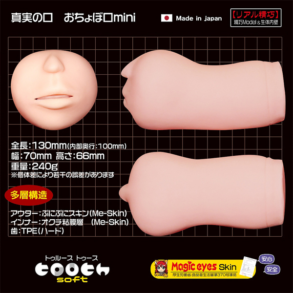 ふわっと柔らかい!元祖「真実の口」よりミニサイズが登場!未経験のような優しさと下手くそさを再現した日本製の非貫通オナホ♪手に馴染みやすいハンドサイズで喉の奥行は10cmと短め。 外側と、とろけるようなバキューム感を与える内部の舌や喉ちんこに加え、先端部分を刺激するTPE素材の歯まで本物に違わぬ精巧な作り。 ビジュアル、実用性どちらもこだわりたい方に!ローション付