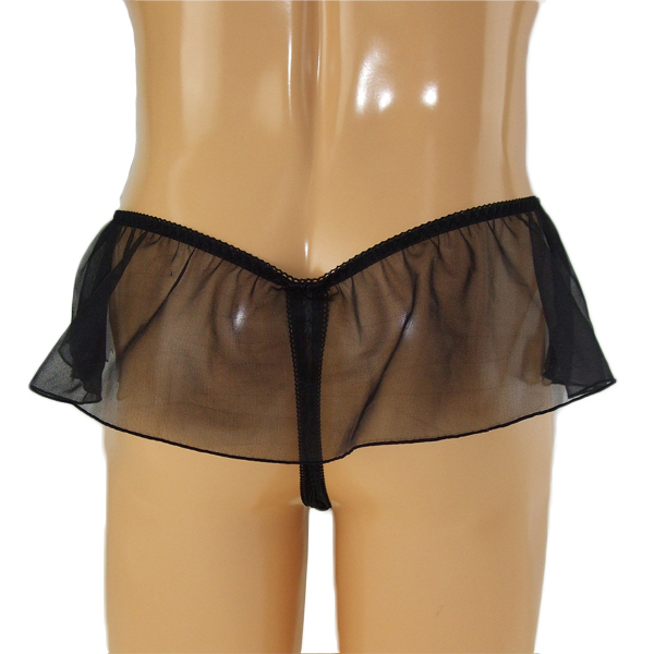 > メンズ シースルースカート付きレース刺繍Tバック (ブラック)