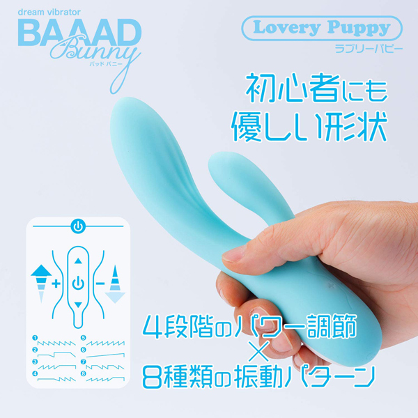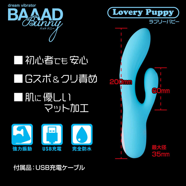 初心者さんにも最適な可愛い「バッドバニー」シリーズより、大きな面でクリを刺激するUSB充電式バイブ「ラブリーパピー」。 肌触りの良いマットなボディが、4種類の強弱と8種類の振動パターンでGスポとクリを同時に刺激!可愛らしいボディが生み出すパワフル振動に貴女も虜になる♪お手入れ簡単、丸洗い可能な生活防水仕様!充電ケーブル付属