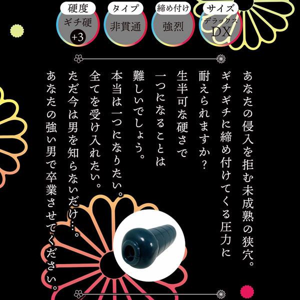 あなたの侵入を拒む未成熟の狭穴。 ギチギチに締め付けてくる圧力に耐えられますか?本製品は「ギチ硬(+3)」と呼ばれる硬度を採用しております。 これは9種類ある硬度の中で2番目に硬いものです。 この素材でしか実現できない強い締まりを再現しました。 サイズもスタンダードより一回り大きなものとなり正にデラックス。 あなたの全てを受け入れる準備を整えております。