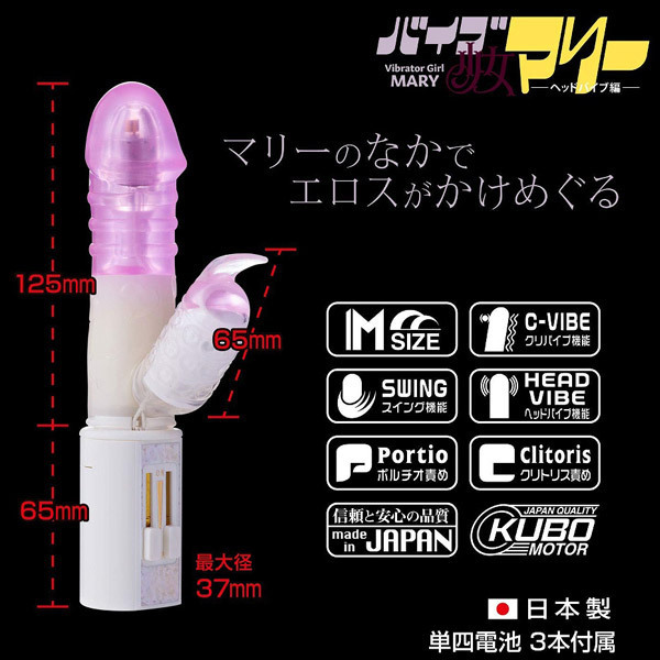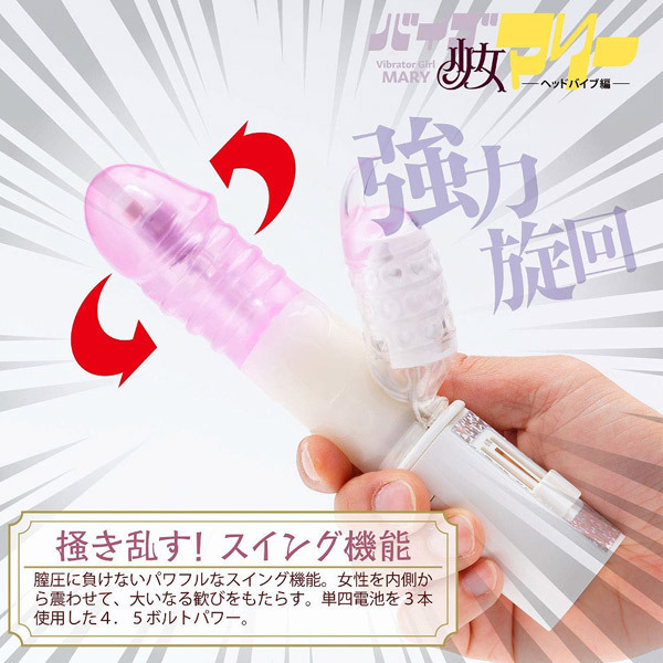 バイブ少女マリー、ヘッドバイブ編はワイドな面でクリちゃんを責めるスイングバイブです。 大きな面でクリトリスを集中して刺激、しっかりとパワーを伝達します。 またスイングは膣圧に負けないパワフル仕様、内側から女性を掻き乱します。 本体先端には強力なヘッドバイブを搭載、これによりジンジンと響く様な刺激を実現しました。 ●無段階強弱調整