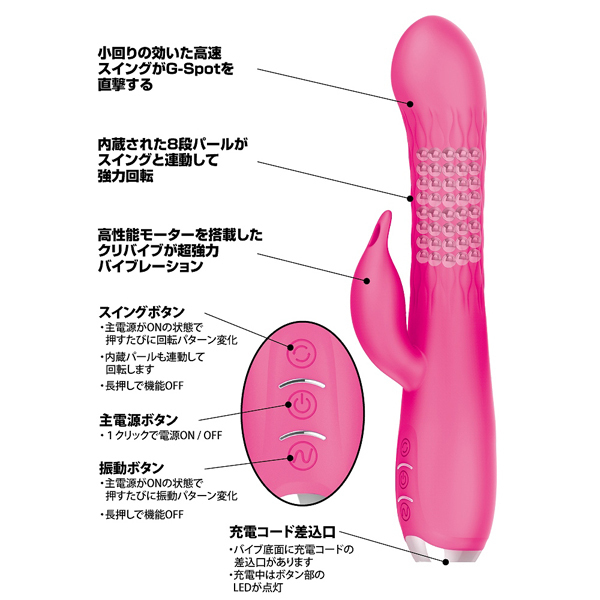48個の回転パールが膣内を掻き乱す!3種のスイング&12種類の振動機能が付いたUSB充電式バイブ。 8段×6連で設置されたパールがスイングと連動して強力回転!さらに追い打ちをかけるように高性能モーターを搭載した子機で敏感ポイントを徹底刺激する♪生活防水加工を施した高品質シリコンボディ仕様◎個別での動作操作も可能